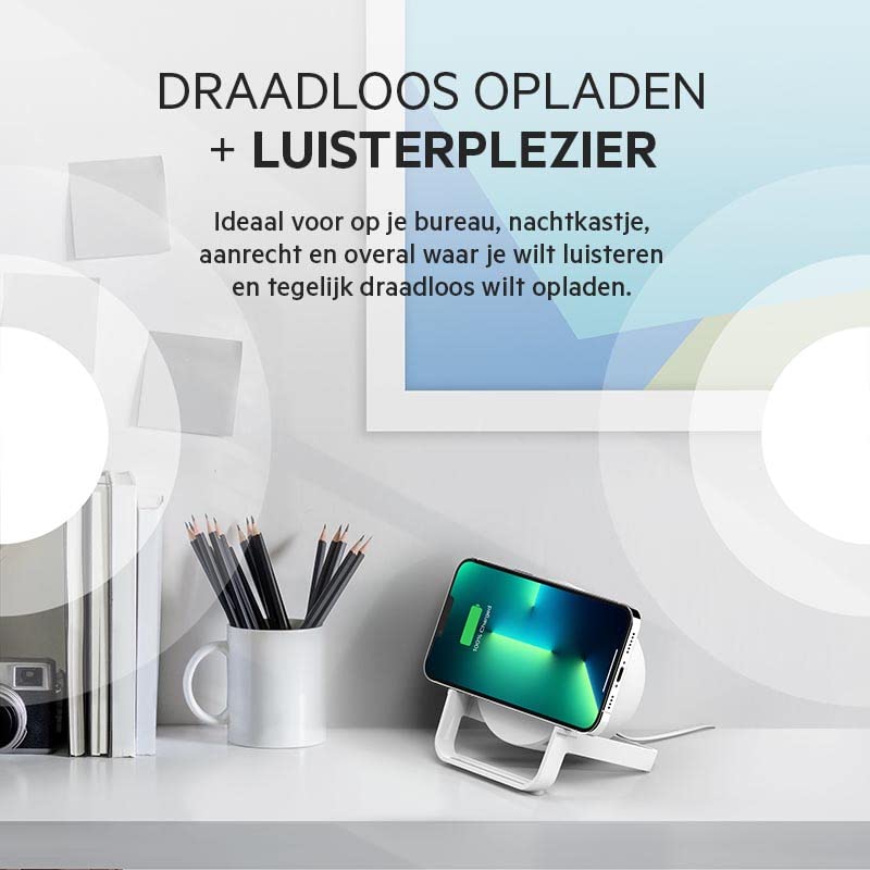 Laat je afspeellijst tot leven komen met geluid van hoge kwaliteit terwijl je je smartphone draadloos oplaadt.