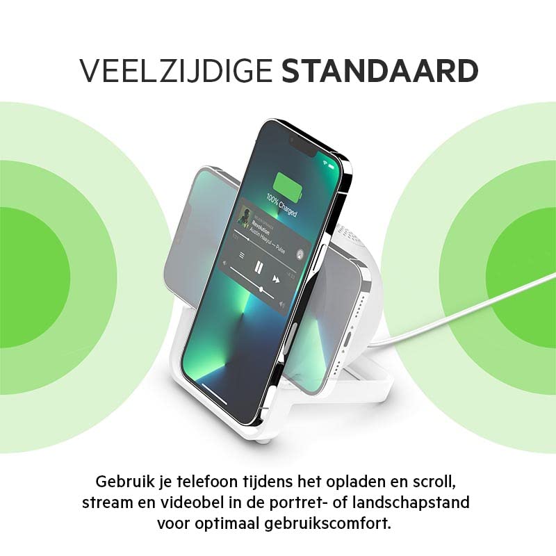 Belkin AUF001vfWH SoundForm Charge, draadloze lader + luidspreker, Bluetooth-luidspreker + draadloze laadstandaard, laad op terwijl je muziek beluistert, video’s streamt of videobelt – Wit